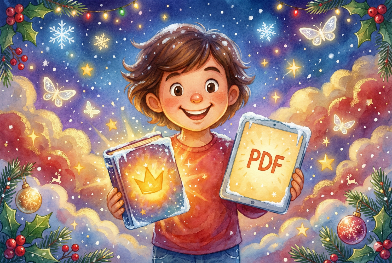 Ton histoire personnalisée est disponible en livre imprimé (PDF offert) ou en version PDF seule, à petit prix.
